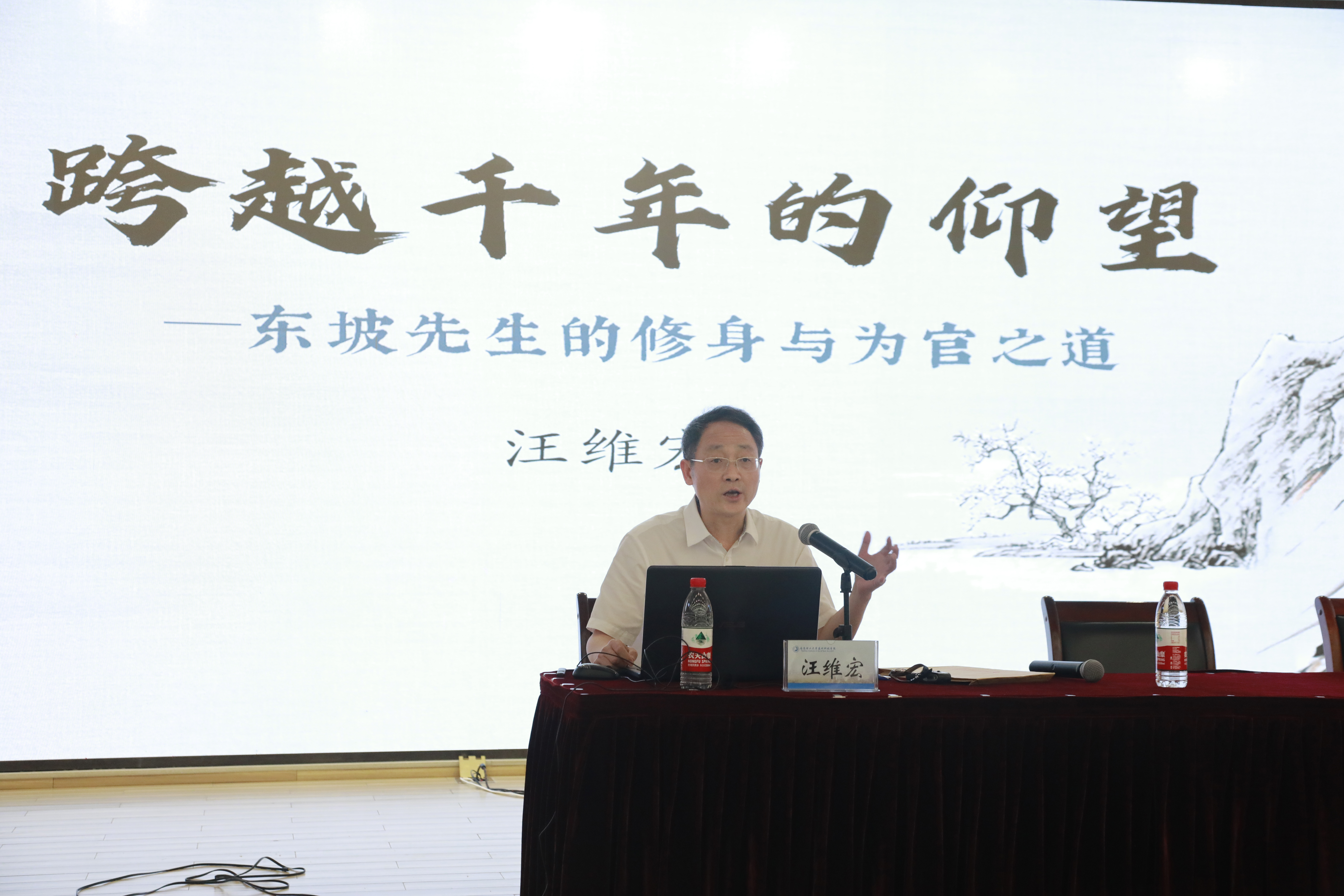随后,南京大学政府管理学院博士,苏香江苏全民阅读基金会理事长,江苏省全民阅读促进会常务理事,凤凰出版传媒集团原董事、副总经理汪维宏先生为广大师生带来本届读书节重要活动——“名家讲坛”第一讲。汪维宏以“跨越千年的仰望——东坡先生的修身与为官之道”为题,分享自己多年来对苏东坡其人其文的深刻体悟。