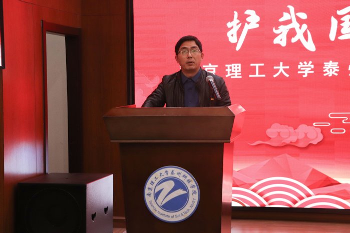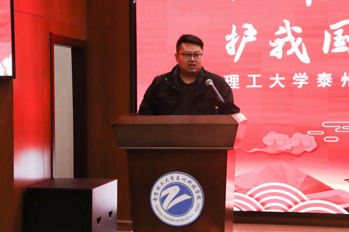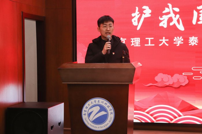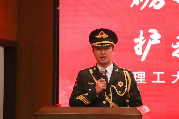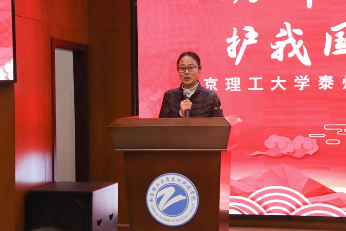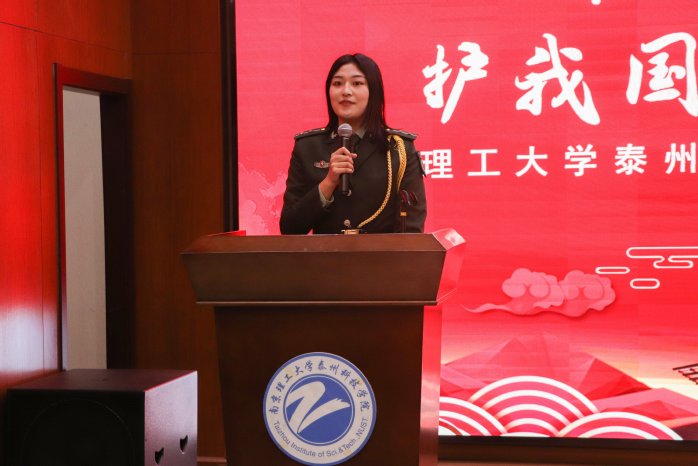 驻泰高校国旗护卫队代表南京中医药大学泰州校区国旗护卫队队长李玟同学致辞。李玟表示,护卫队是学校国防教育的重要阵地,对加强国防教育具有示范作用,希望队员们肩负使命和责任,高标准要求自己。