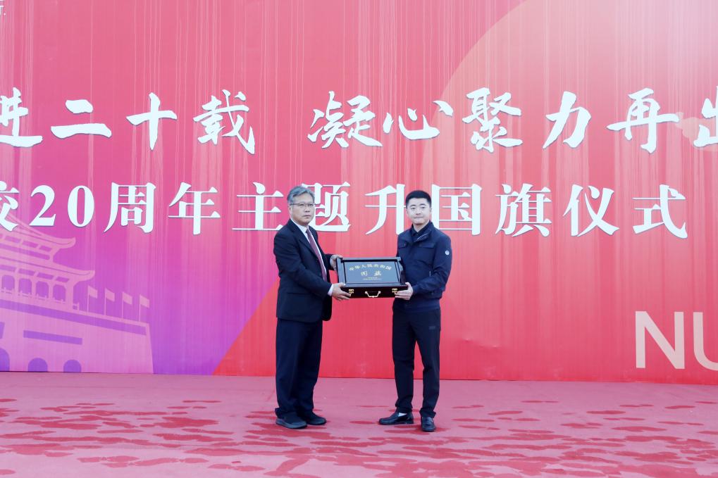 仪式现场,学校收到了一份特殊的“贺礼”, 2008级土木工程专业校友顾文向母校赠送了一面曾在天安门广场升起的五星红旗。